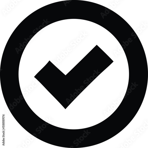 A bold black checkmark symbol is centrally placed within a thick black circular border against a clean white background