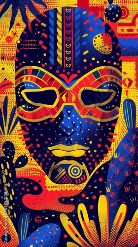 A bold, colorful depiction of a luchador mask with intricate patterns, capturing the spirit of Cinco de Mayo