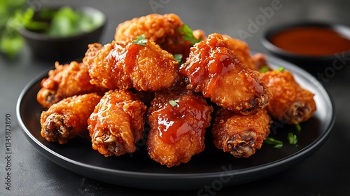 A bold, dramatic food shot of buttermilk-fried chicken wings, deep golden crispy coating, bright tangy barbecue sauce artistically drizzled, served on a sleek black plate, extreme close-up,