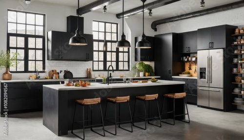 A bold, industrial-style kitchen with black steel finishes, exposed lighting, and matte surfaces