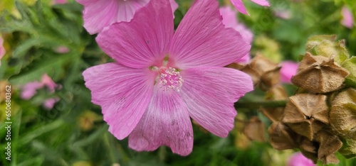 a bold pink flowering musk mallow (Malva moschata) in a meadow