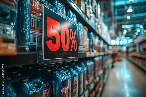 A bold sign in a supermarket displaying 50% in red text on a black background, indicating a significant discount or sale.