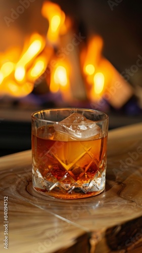 A bold whiskey-based cocktail that evokes images of a cozy fireplace, super realistic