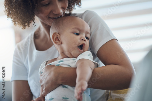 A bond grows with cuddles and kisses. Shot of a young woman relaxing with her adorable baby girl on the sofa at home.