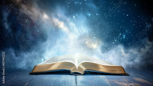 A book is open to a page with a blue background and a lot of white stars. The book appears to be a fantasy novel, as the stars and the blue background create a sense of wonder and magic