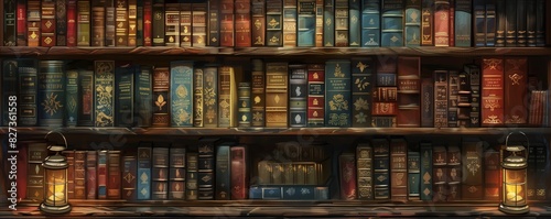 A bookshelf filled with a variety of old, dusty books and illustrations