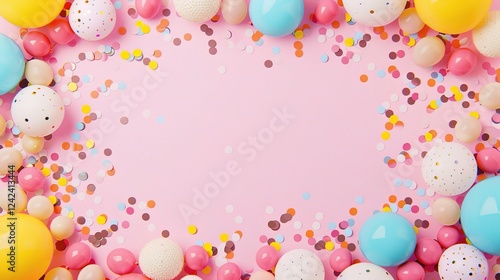 A border of colorful balloons and confetti decorates the pink background, creating a festive and cheerful design perfect for a birthday party or any celebration