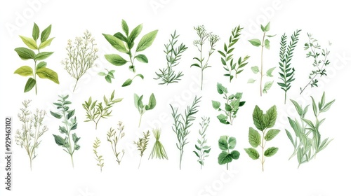 A botanical illustration of various herbs and plants, arranged in a flat lay style against a white background