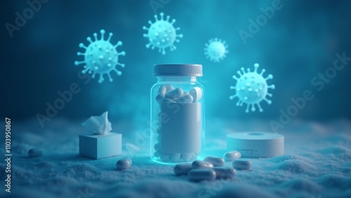 A bottle of cold and flu pills with a soothing glow, surrounded by a virus icon, shield, tissue box, and thermometer. Cool blue tones evoke relief, comfort, and recovery.