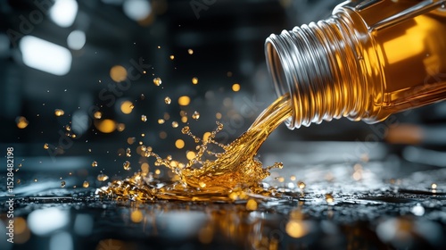 A bottle of golden oil is pouring, creating dynamic splashes against a sleek surface, highlighting the fluidity and versatility of cooking oils in culinary art.