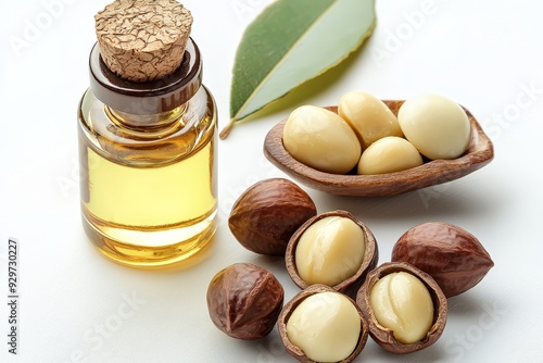 a bottle of macadamia oil with open macadamia nuts - studio product photo