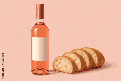 A bottle of rosé wine stands upright, its minimalist label catching the eye. Flanking it are slices of baguette, arranged in a gentle curve,