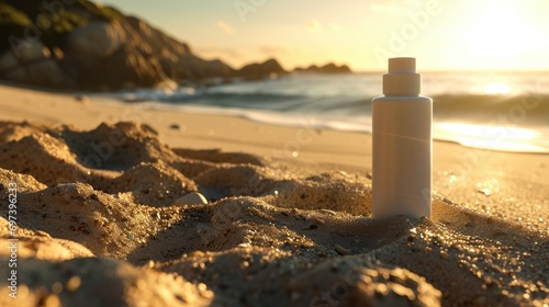 A bottle of sunscreen sitting in the sand on a beach. Perfect for summer vacations and sun protection