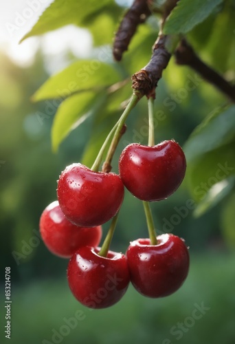 A bountiful cluster of cherries glowing in the summer sun