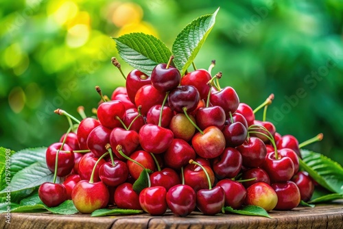 A Bountiful Pile of Ripe Cherries Glistens in the Sunlight, Nestled Amongst Lush Green Leaves on a Rustic Wooden Surface