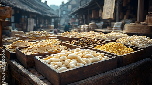 A Bounty of Flavors: A bustling traditional market display, wooden crates brimming with an assortment of dried goods, grains, and spices, inviting the senses to experience the rich culinary heritage.
