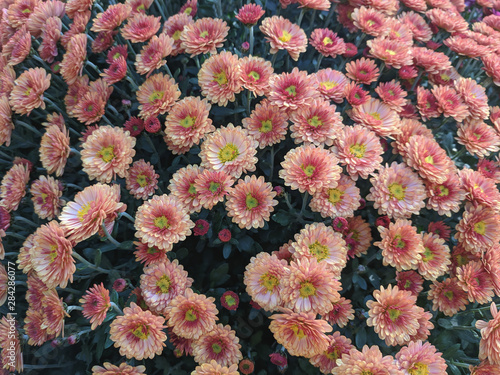 A bouquet of beautiful chrysanthemum flowers outdoors. Chrysanthemums in the garden.