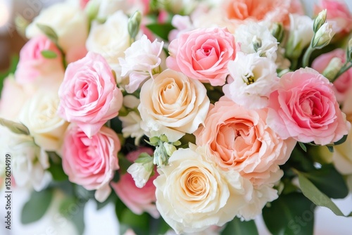 A bouquet of pink and white roses. The roses are arranged in a vase and are in full bloom. Beautiful delicate spring or summer flowers.