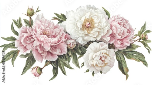 A bouquet of soft pink and white peonies, their petals intricately layered, styled as a vintage botanical study on a pristine white background