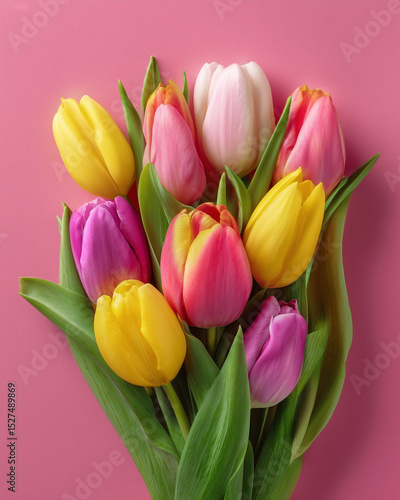 A bouquet of tulips in various colors, including yellow, pink, and purple, arranged in a vase