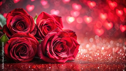 A bouquet of vibrant crimson roses resting on a bed of shimmering glitter, illuminated by a soft glow of heart-shaped bokeh.