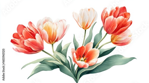 A bouquet of vibrant tulips in shades of red and white, surrounded by green leaves, showcasing natural beauty and floral elegance.