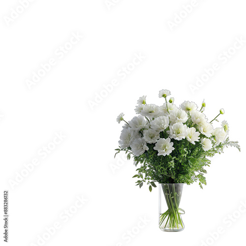 A bouquet of white flowers in a glass vase is displayed against a white background. Generative AI