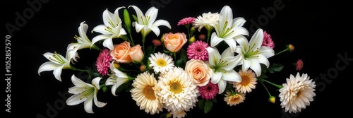A bouquet of white lilies, roses, and chrysanthemums arranged in a heart shape on a black background, floral, remembrance