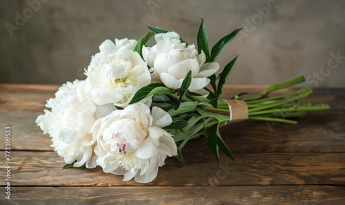 A bouquet of white peonies on a rustic wooden table