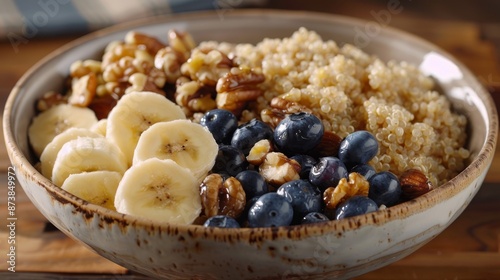 A bowl filled with creamy oatmeal topped with slices of bananas and plump blueberries. The concept of a healthy breakfast.