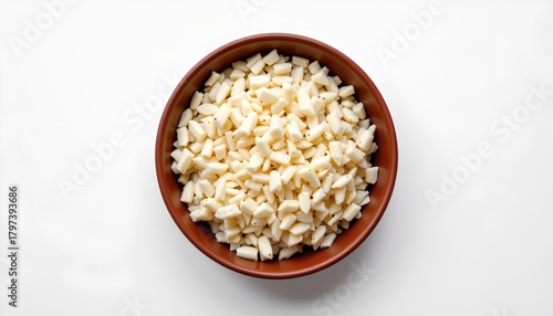 A bowl filled with popcorn kernels is in focus against a blurred background, indicating a close up shot that highlights the texture of the kernels.