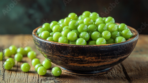A bowl filled with sweet green pearls elegantly arranged on a rustic wooden table bathed in soft warm light