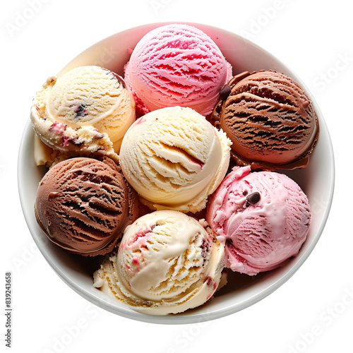 A bowl of assorted ice cream scoops including chocolate, vanilla, and strawberry flavors, presented in a white bowl.