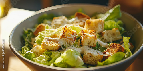 A bowl of Caesar salad with croutons and Parmesan cheese on top, generative AI