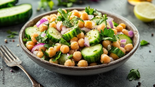 A bowl of chickpea salad with cucumber, red onion, parsley, and seasonings
