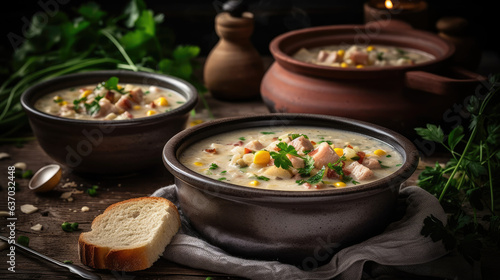 A bowl of chowder made with potatoes, ham, bacon, and sweetcorn. It is garnished with chopped parsley and ground black pepper. In the background, there are two bowls, and in the front, ladle. copy.