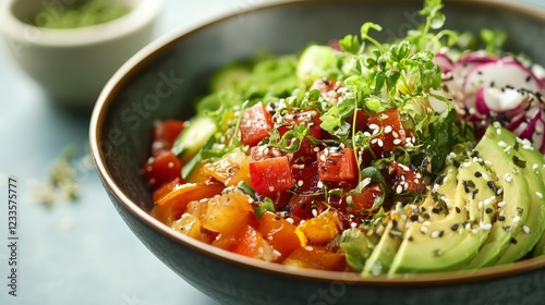 A bowl of colorful salad with fresh vegetables, avocado, and a drizzle of dressing. Healthy eating
