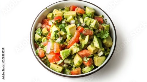 A bowl of creamy avocado salsa with diced avocado, tomatoes, onions