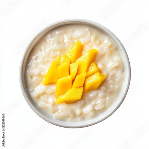 A bowl of creamy coconut milk rice pudding with mango slices, isolated white background, surreal art style