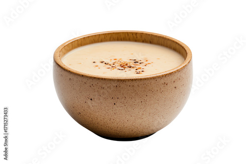 A bowl of creamy soup with a sprinkle of seasoning on top, perfect for showcasing comfort food in a stylish setting.