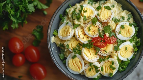 A bowl of delicious, flavorful egg salad served with herbs and tomatoes.