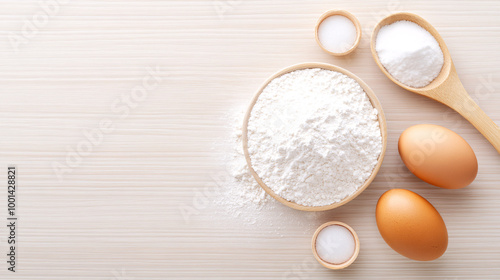 A bowl of flour, two eggs, salt, and baking soda arranged on a light wood background.