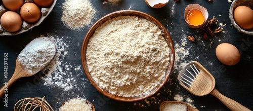 A bowl of flour with eggs, a wooden spoon, and a whisk on a black background.