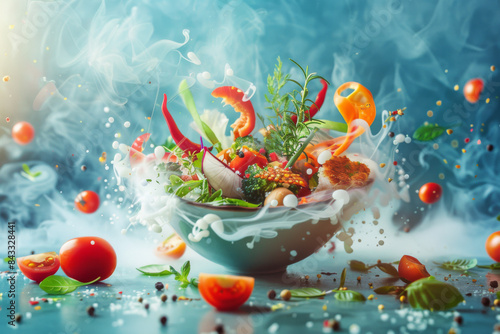 A bowl of food with a lot of vegetables and a lot of steam coming out of it