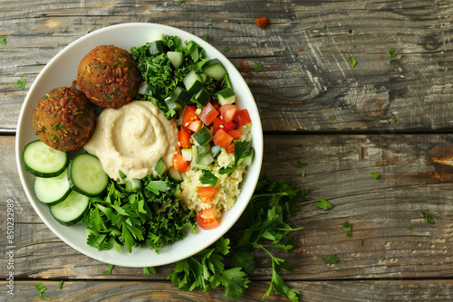 A bowl of food with a variety of vegetables and dips. The bowl is on a wooden table