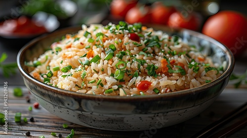 A bowl of freshly cooked fried rice garnished with chopped green onions and vegetables, placed on a wooden table with tomatoes and spices in the background.