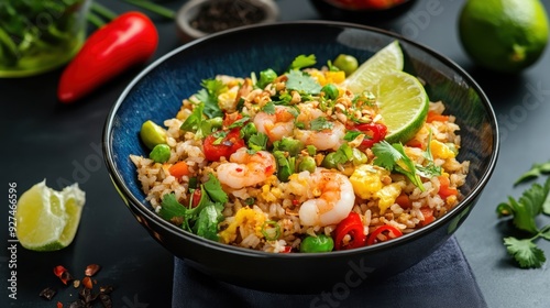 A bowl of fried rice with colorful vegetables and herbs, garnished with lime wedges