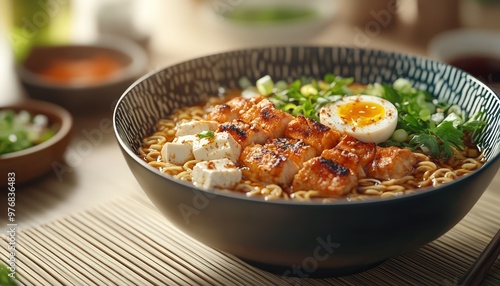 A bowl of fusion ramen with grilled chicken, tofu, and soft-boiled egg, resting on a bamboo mat, cozy ramen bar with dim lighting and warm ambiance, peaceful style, 3D render, clos
