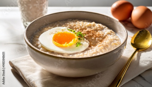a bowl of homemade porridge with grains and egg on top served on a marble table in natural sunlight for a healthy start to the day