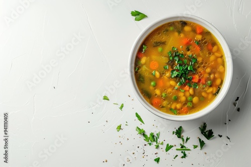A bowl of hot soup served on a clean and white table, perfect for a cozy meal or as a prop in your photography project